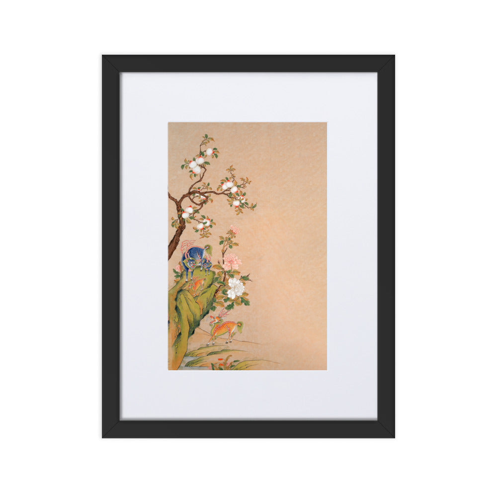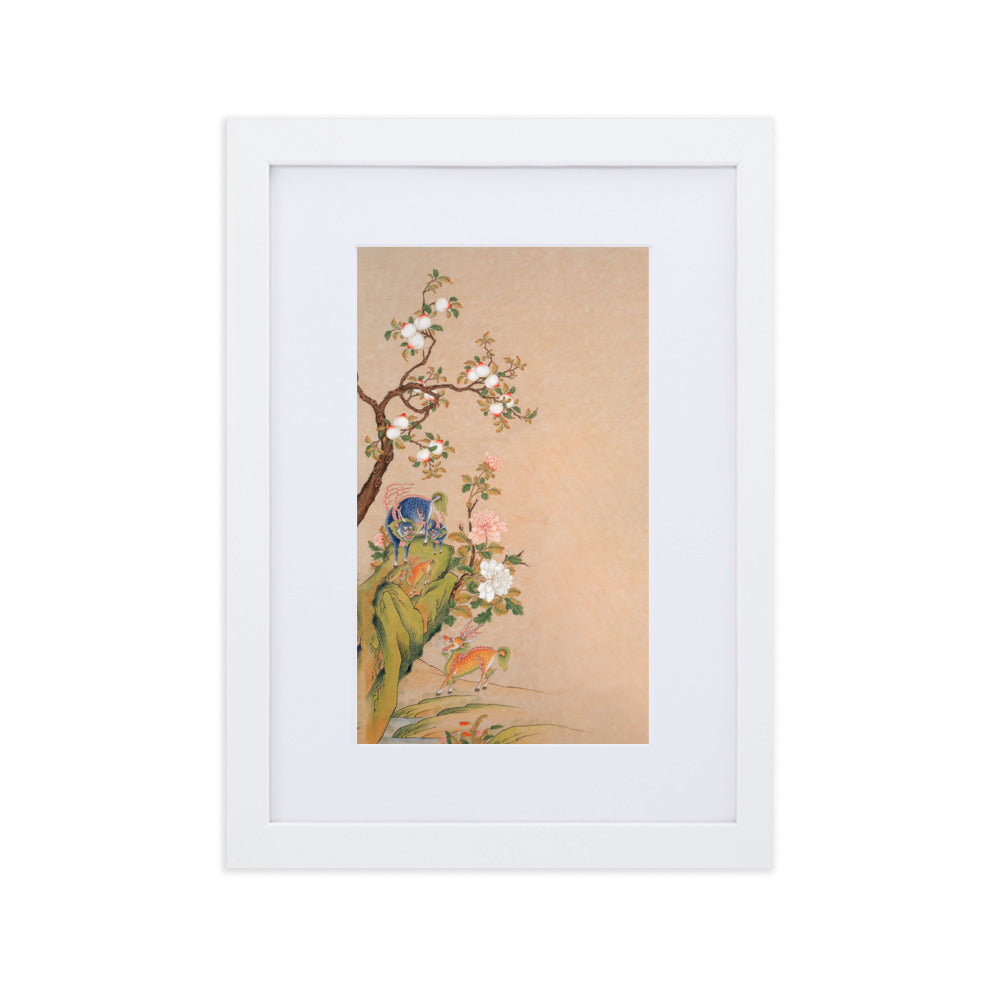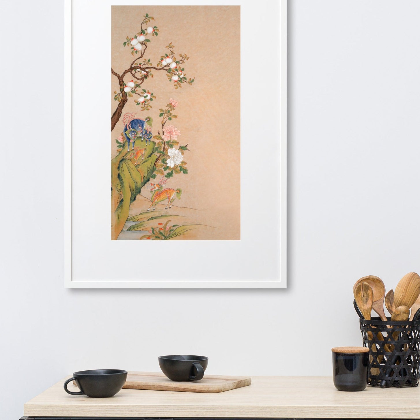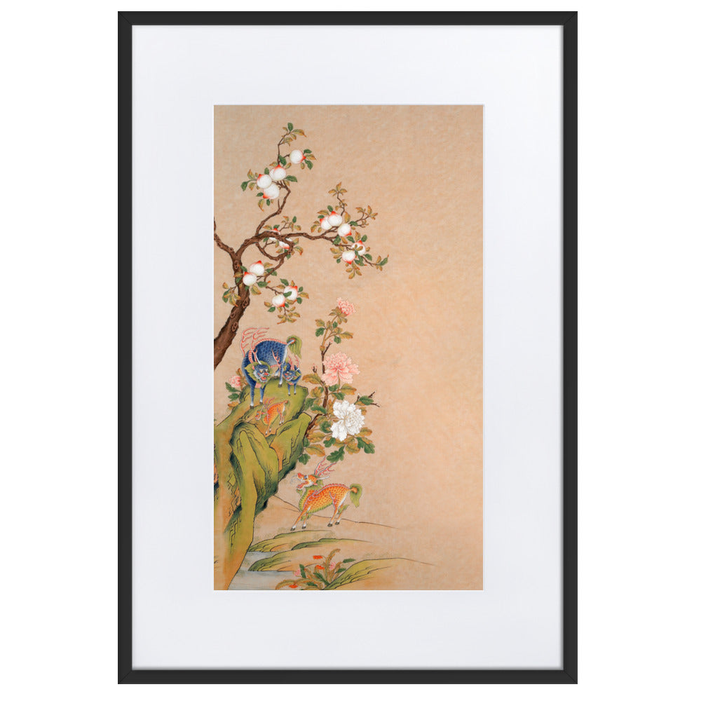 Characteristic for Seosudo is the depiction of the animals together with their offspring. This pictorial formula refers to marital harmony as well as the wish for fertility and many descendants. Central motifs include the Qilin, a giraffe-like mythical creature as a sign of a peaceful and just time, as well as the Haetae, which was believed to pass moral judgments and protect against destructive forces such as fire. Additionally, lucky fruits appear, including the peach as a symbol of long life and the Buddha’s hand citron as a symbol of blessing and prosperity.