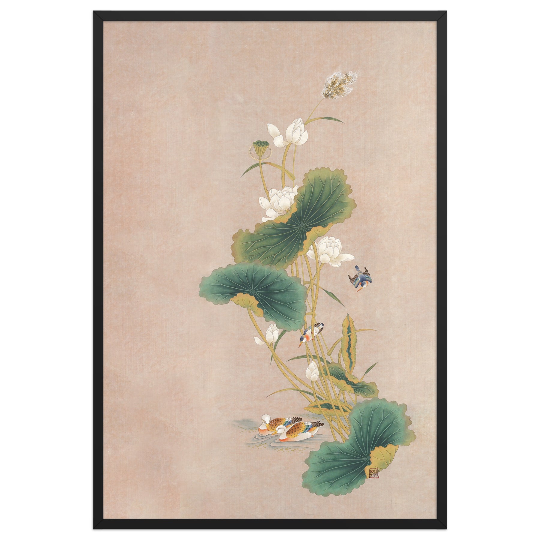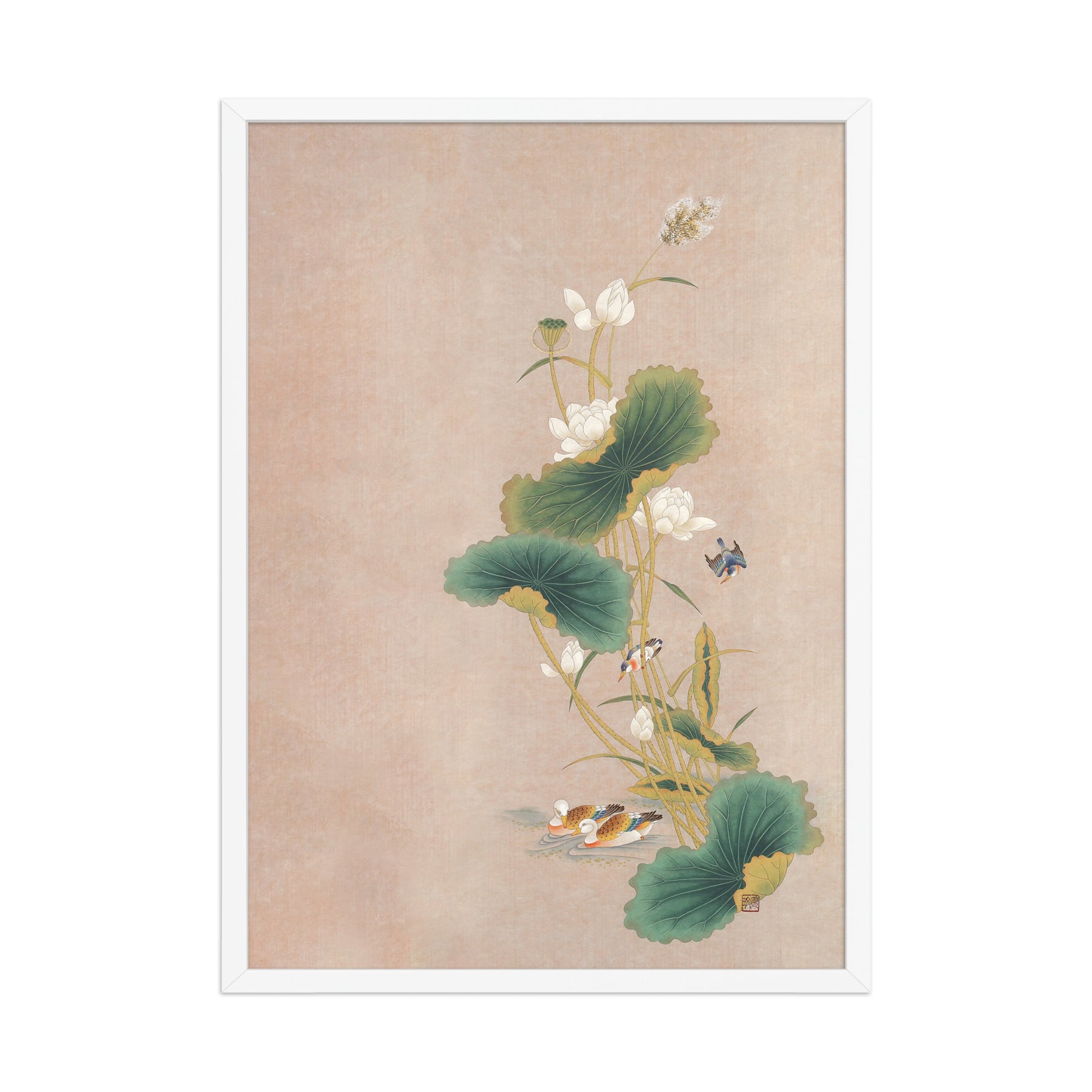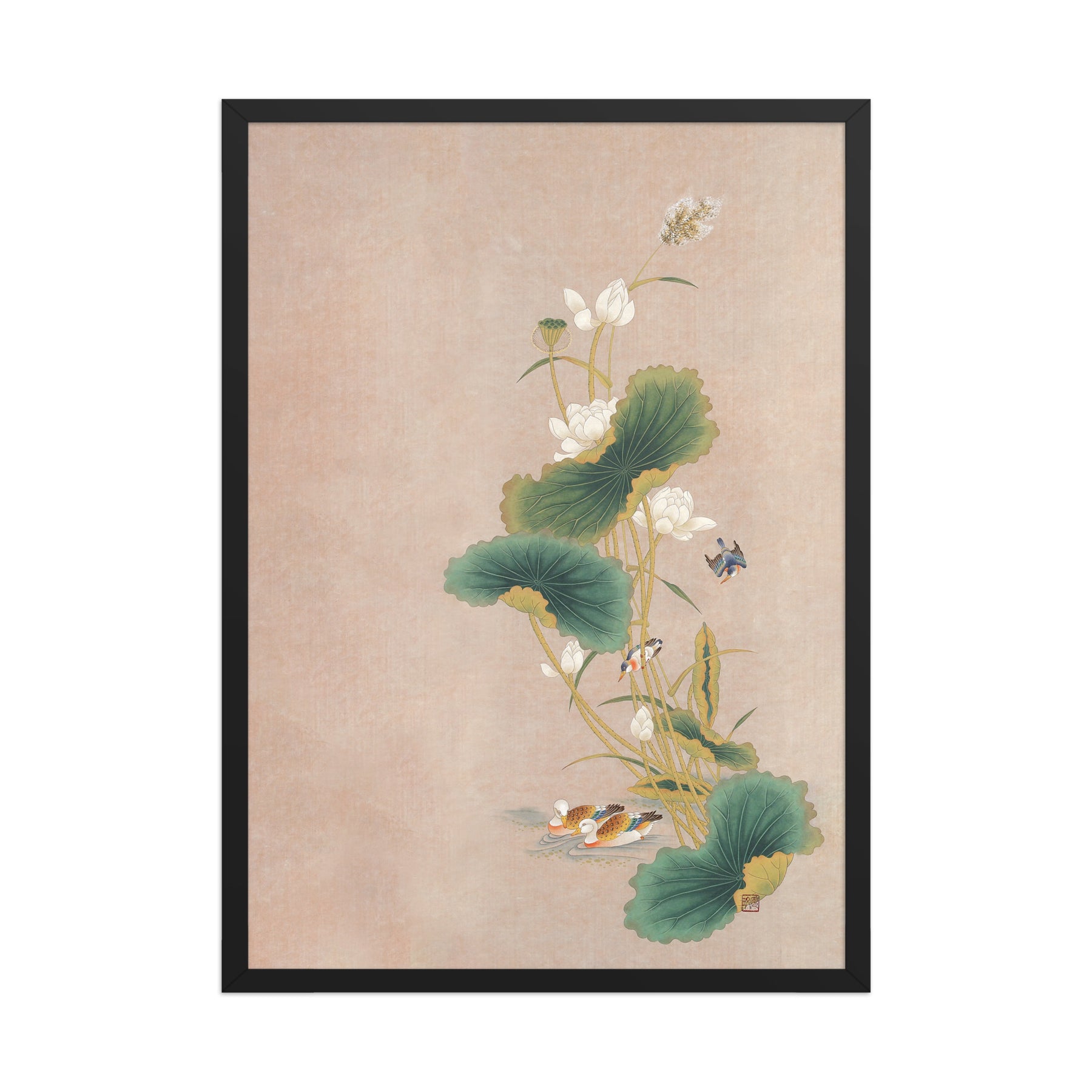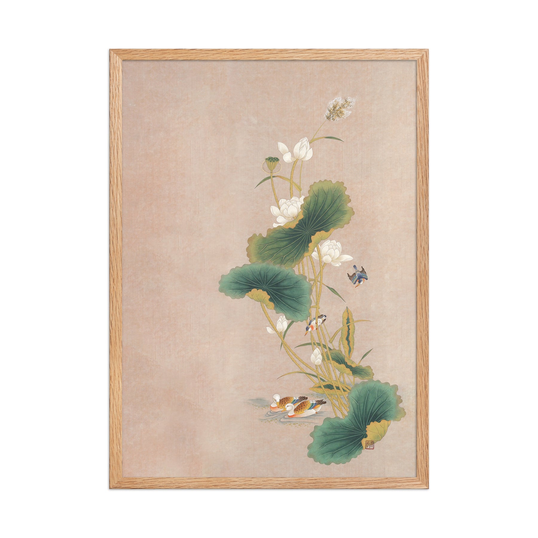 Con questo poster incorniciato - Seungmin Yoon, Fiori di loto con uccelli, darai un tocco distintivo a ogni ambiente. Stampato su carta di alta qualità, spessa e opaca.