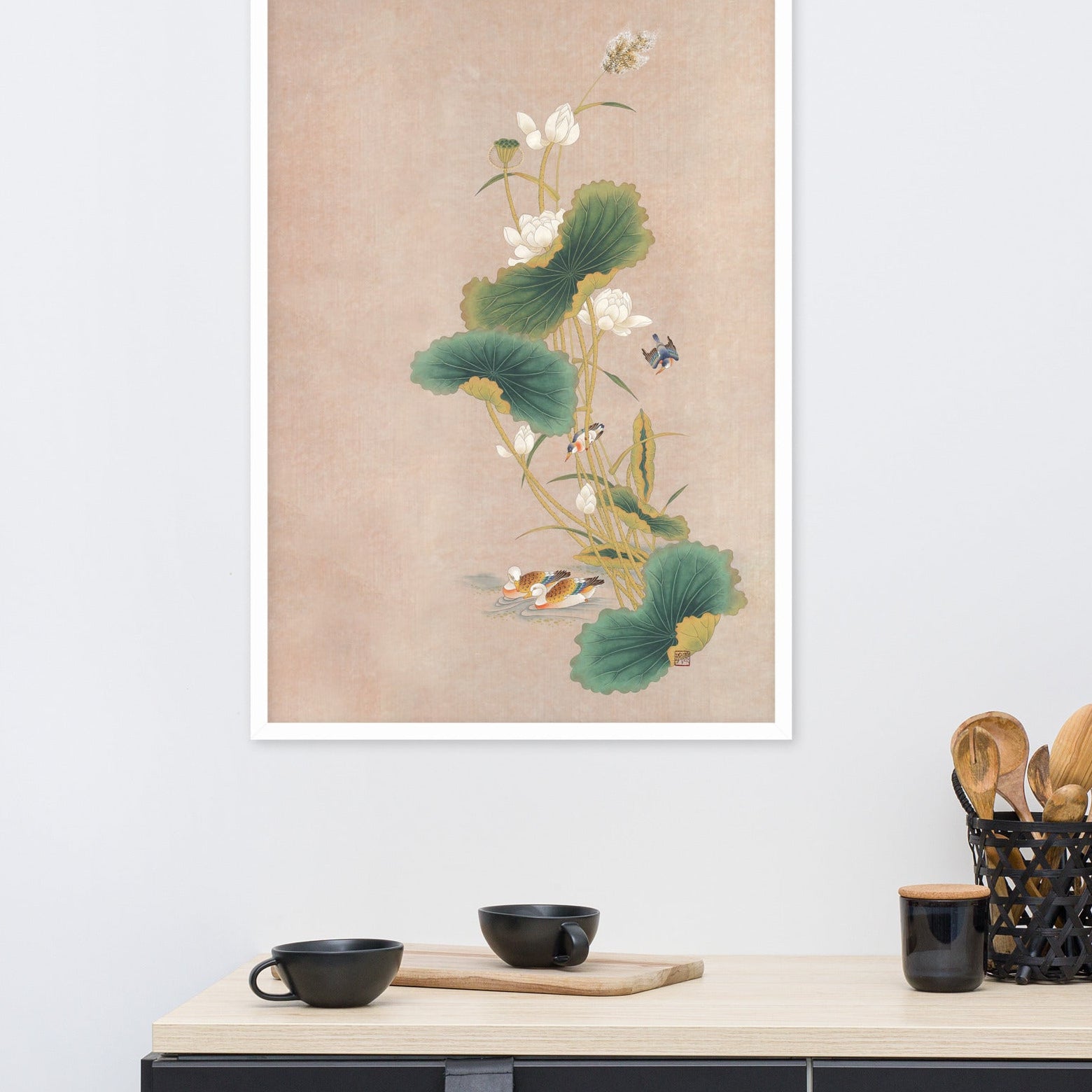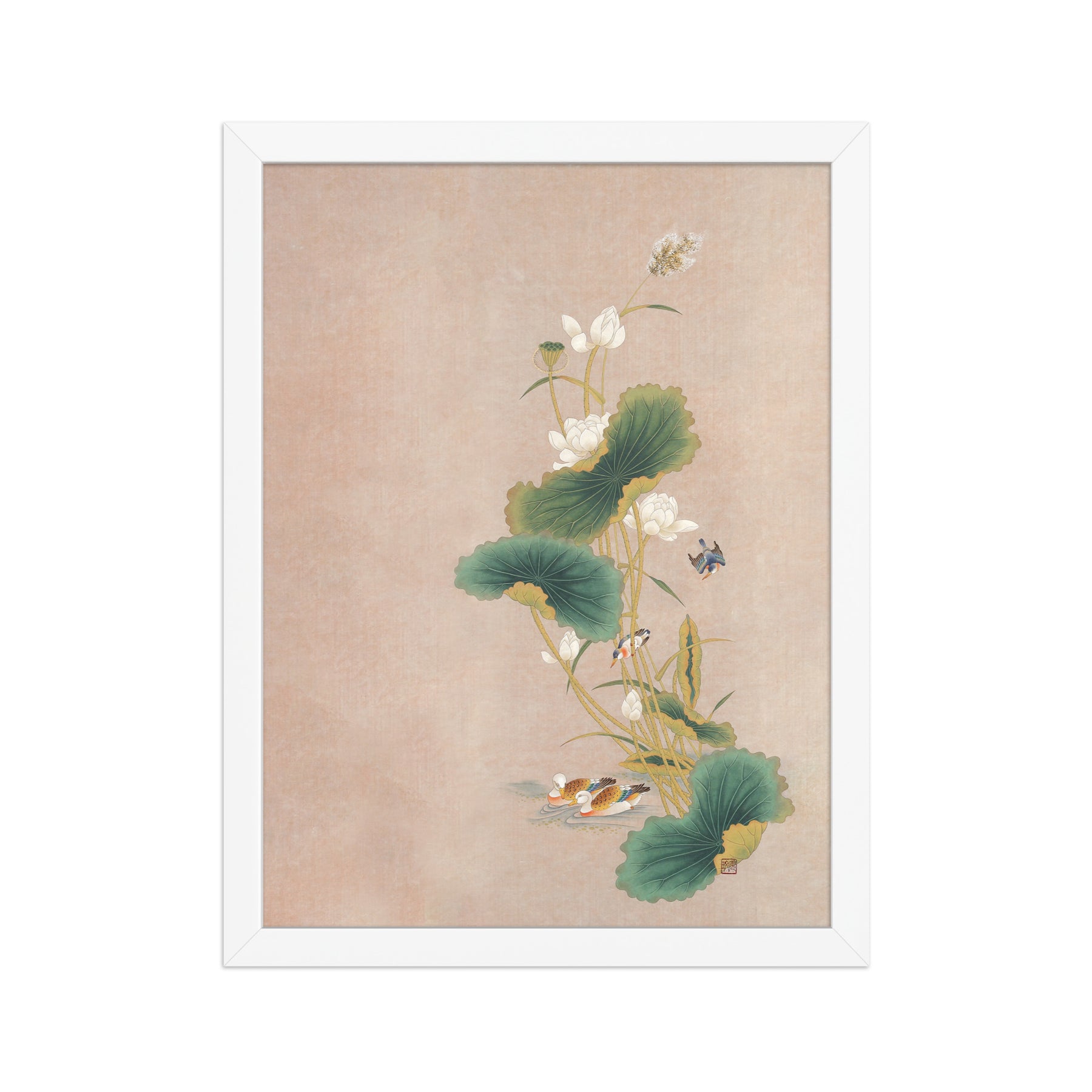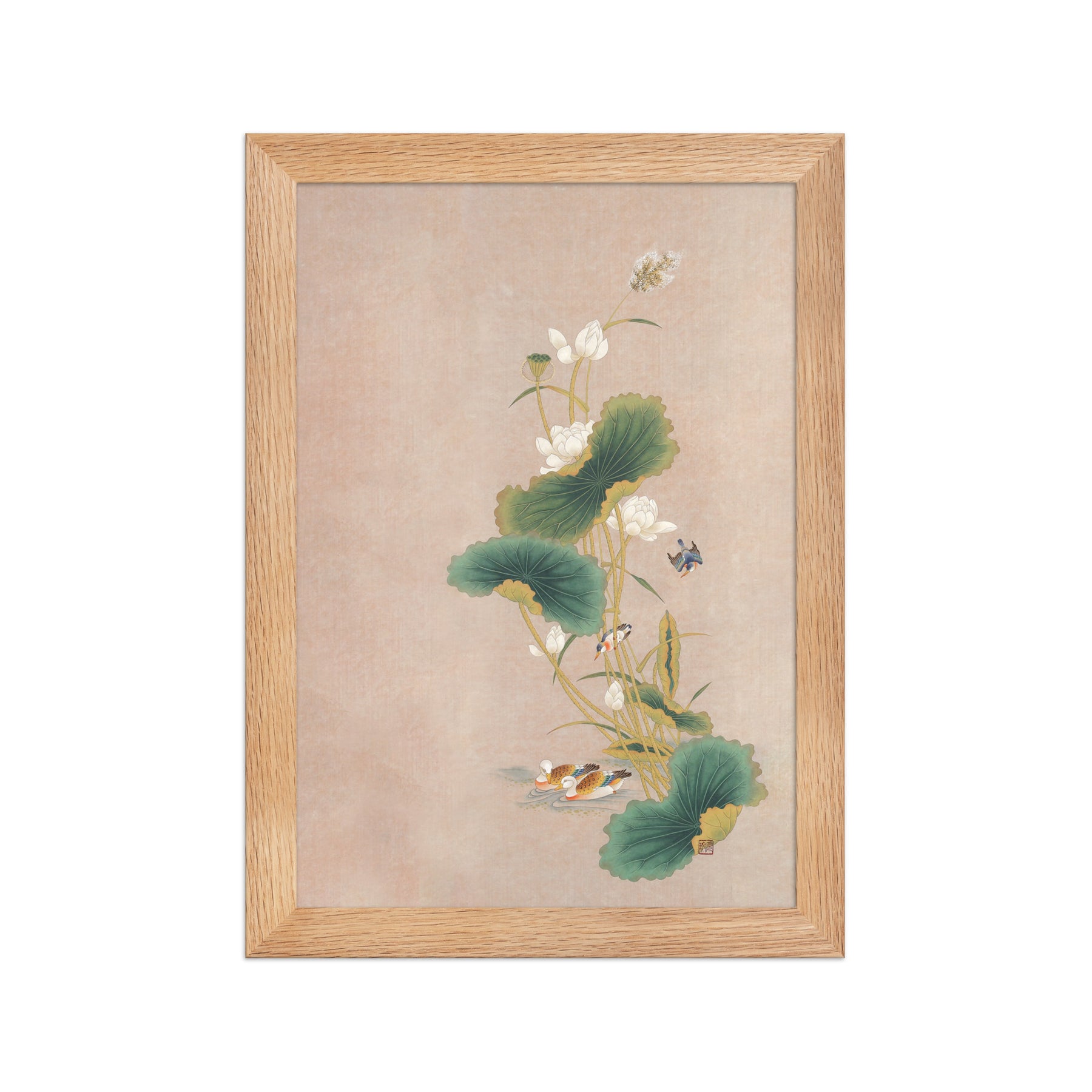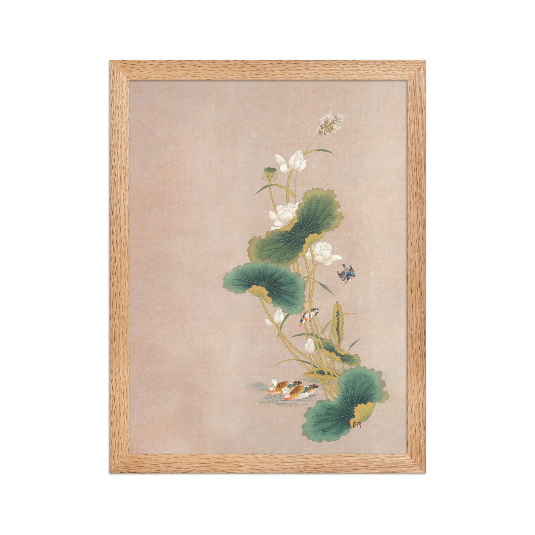 Con questo poster incorniciato - Seungmin Yoon, Fiori di loto con uccelli, darai un tocco distintivo a ogni ambiente. Stampato su carta di alta qualità, spessa e opaca.
